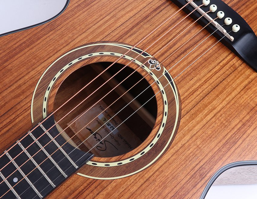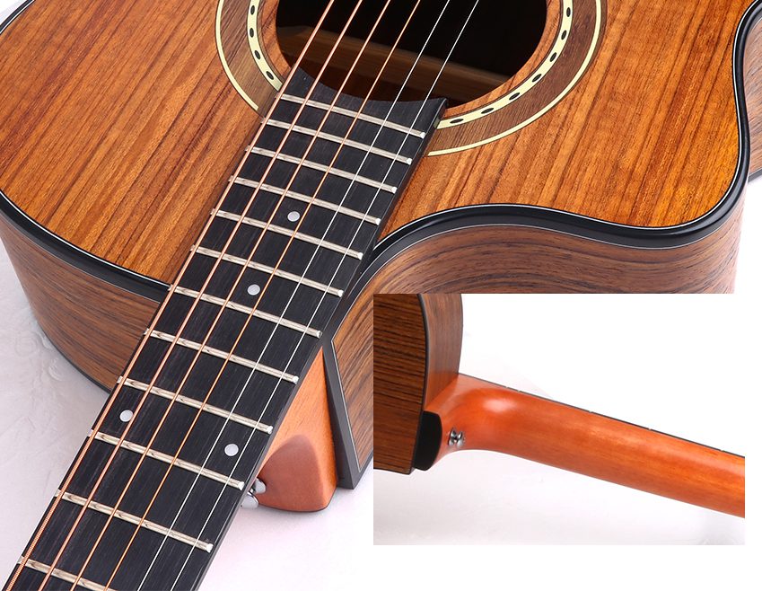 When the folk guitar features a rosewood fingerboard and a mahogany neck, its advantages become obvious. The rosewood fingerboard is hard and highly wear-resistant, able to withstand frequent pressing for extended periods without easily wearing out, greatly extending the guitar’s lifespan. Additionally, its moderate grain texture provides excellent tactile feedback, making it easier for players to execute techniques like bending and sliding, allowing for a nuanced emotional expression. The mahogany neck brings unique tonal characteristics to the guitar. It imparts warmth and fullness, with a particularly strong presence in the low and mid frequencies, resulting in full and deep-sounding chords, creating a rich emotional atmosphere when performing lyrical pieces. Moreover, mahogany has a moderate weight, balancing strength and stability, making it resistant to deformation while ensuring a good connection between the neck and body, allowing the guitar to maintain good tuning over time, providing players with a stable and reliable playing experience, whether for stage performances or daily practice.