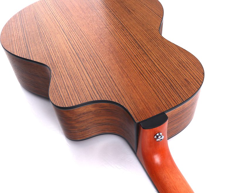When the back and sides of the folk guitar are made of walnut, it brings a series of unique advantages. From an acoustic perspective, walnut has a moderate density that effectively enhances the guitar’s resonance. It allows sound to fully reflect and disperse inside the guitar body, making the tone richer and more layered. When you strum chords, you can clearly feel the harmonious blending of notes, as if each sound has found its perfect home. Visually, the unique grain and warm color of walnut give the guitar a distinctive beauty, making it both an artistic and practical instrument, doubling as a decorative piece in your home. Additionally, the good stability of walnut is also reflected in the back and sides. It can withstand a certain degree of environmental humidity and temperature changes, reducing the likelihood of deformation or separation caused by environmental factors, thus extending the guitar’s lifespan, allowing your musical companion to last long. Furthermore, the relatively light weight of walnut, while ensuring good tone, reduces the overall weight of the guitar, allowing for extended play without excessive fatigue, providing players with a more comfortable experience.