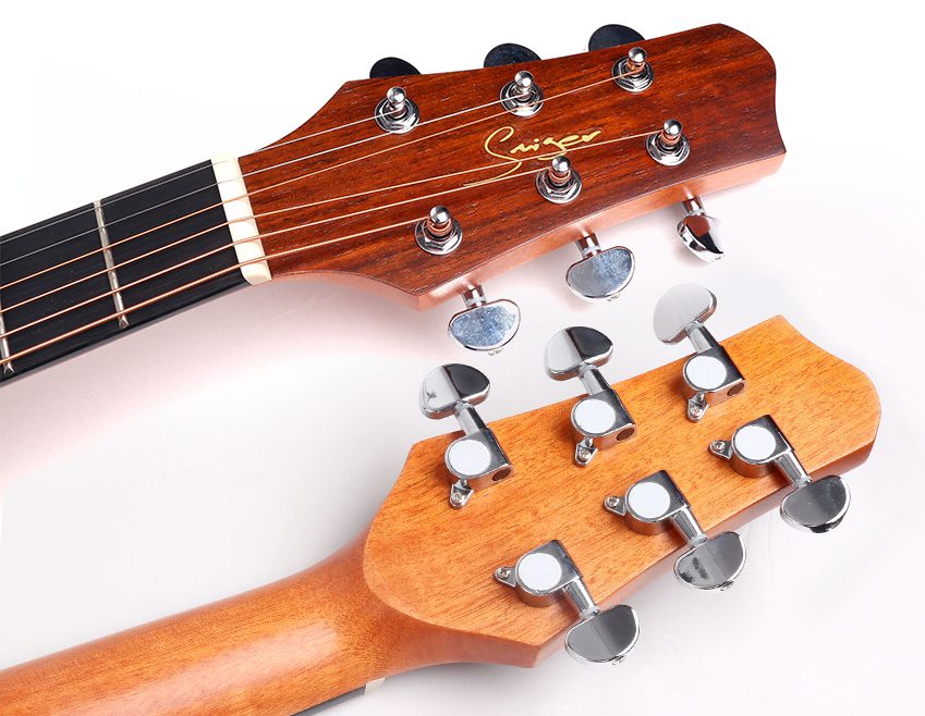The fully enclosed tuning pegs of the folk guitar offer numerous practical advantages. First, their enclosed structure effectively protects against the intrusion of dust, moisture, and other impurities. During everyday use and storage, these factors can gradually corrode the metallic components inside the tuning pegs, leading to rust, corrosion, and affecting the normal operation of the tuning system. The fully enclosed tuning pegs form a solid protective barrier that greatly reduces the likelihood of these issues arising, prolonging the lifespan of the tuning pegs and keeping the guitar looking new. Additionally, fully enclosed tuning pegs demonstrate excellent tuning stability. Their precise gear structure and sealed design reduce the chances of tuning instability caused by external vibrations or light touches. When you carefully tune your guitar, whether performing passionately on stage or immersing yourself in the musical world at home, you won’t have to worry about the strings going out of tune easily, as they will always maintain accurate pitch, providing players with reliable tuning assurance. Furthermore, the appearance of fully enclosed tuning pegs is generally more refined, harmonizing beautifully with the overall design of the guitar, enhancing both the practicality of the guitar and adding a unique charm.