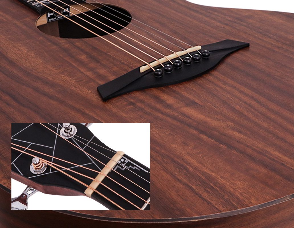 Верхний и нижний порожек этой акустической гитары folk изготовлены из материала кости коровы, что демонстрирует качество и внимание к деталям. Порожек из кости коровы имеет твердую структуру, может эффективно передавать вибрацию струн и обеспечивать четкий, яркий и полный звук. Он также имеет хорошую износостойкость и может долго сохранять стабильные характеристики. Во время игры порожек из кости коровы может полностью проявить свои преимущества и принести вам богатое и тонкое звучание, сделать каждую ноту полной очарования и эмоций и сделать ваше исполнение более трогательным.