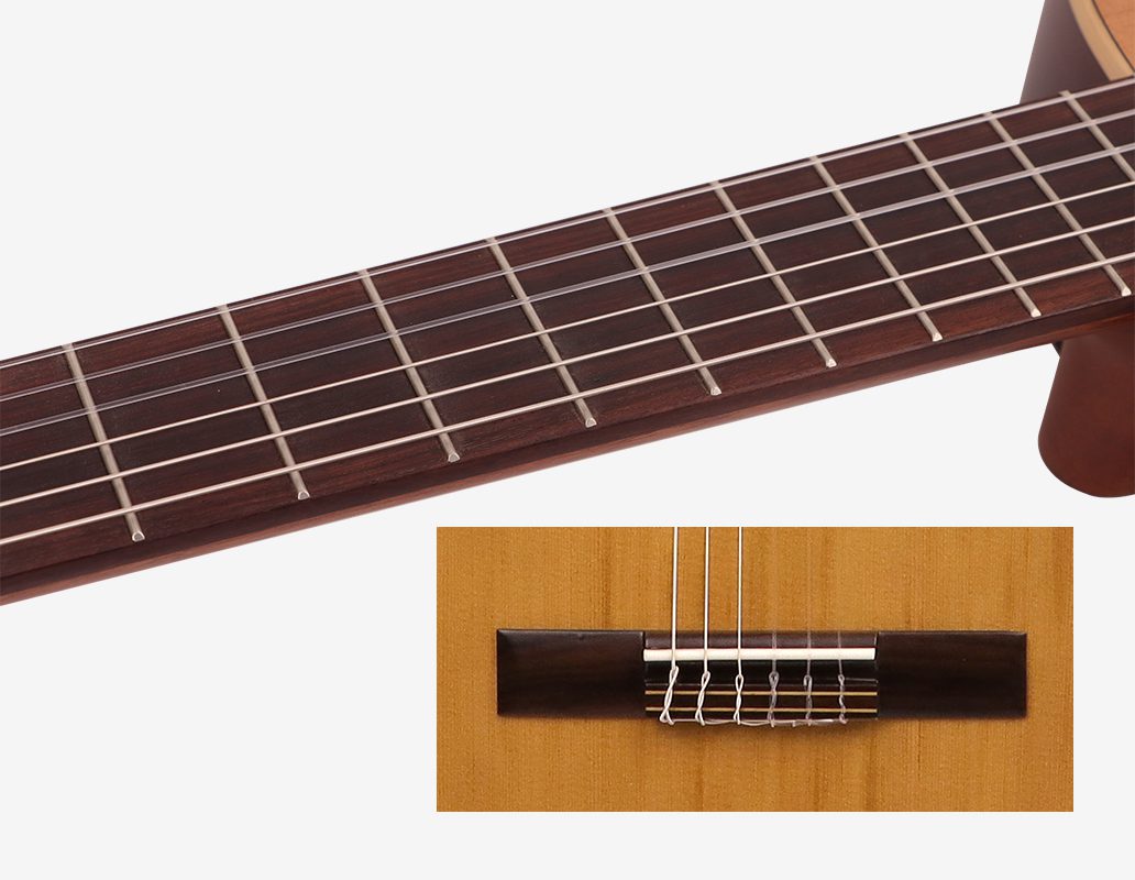 古典吉他的指板和琴桥选用印度玫瑰木有诸多妙处。印度玫瑰木质地坚硬,能承受频繁的按弦和拨弦,确保指板和琴桥的长久耐用,不易磨损。其出色的密度有助于声音的传导,使音色更加清晰、饱满且富有共鸣。在演奏时,印度玫瑰木的指板手感顺滑,有助于演奏者精准控制音准和各种技巧。而琴桥能有效地传递琴弦振动,增强延音效果,让声音更加悠扬动听。印度玫瑰木赋予了古典吉他更优质的演奏性能和出色的音色表现。 |